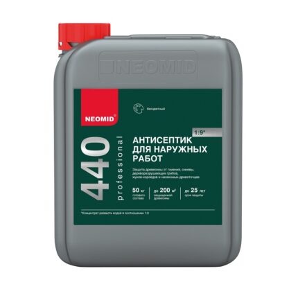 Эффективный концентрат Neomid 440 Еco, разводимый водой в пропорции 1:9, образует бесцветную защиту для дерева. Подходит для наружных работ. Легко наносится кистью, валиком, распылением или погружением.