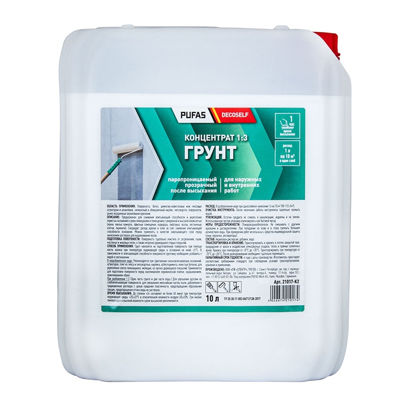 Грунтовка-концентрат Pufas Decoself – это укрепляющий состав глубокого проникновения, разработанный для подготовки различных поверхностей перед отделочными работами. Идеально подходит для обработки стен и потолков перед покраской, оклейкой обоями или нанесением декоративной штукатурки.