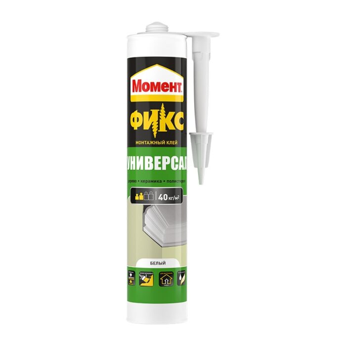 Забудьте о гвоздях и шурупах! “Момент FIX Универсал” – это готовый к применению клей на акриловой водной дисперсии, созданный для прочного и долговечного соединения различных материалов. Этот универсальный солдат от Брендыа “Момент” легко справится с фиксацией керамической плитки, пенополистирола, кирпича, дерева, гипсокартона, ПВХ, ABS и ДСП.
