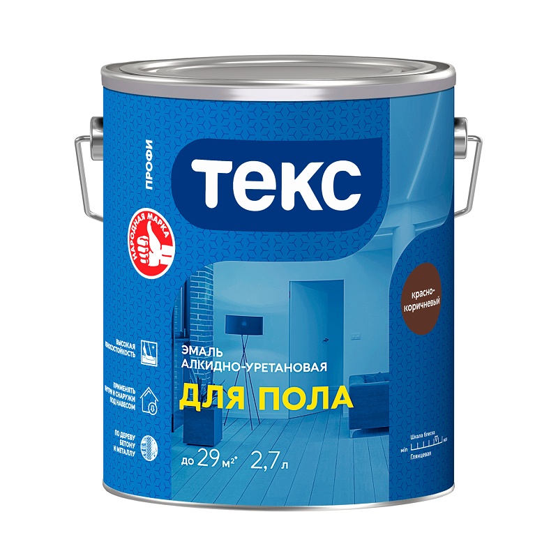 Надежная глянцевая эмаль Текс Профи красно-коричневого цвета для бетонных, деревянных и металлических полов. Объем фасовки 2,7 л, вес брутто 3,21 кг.