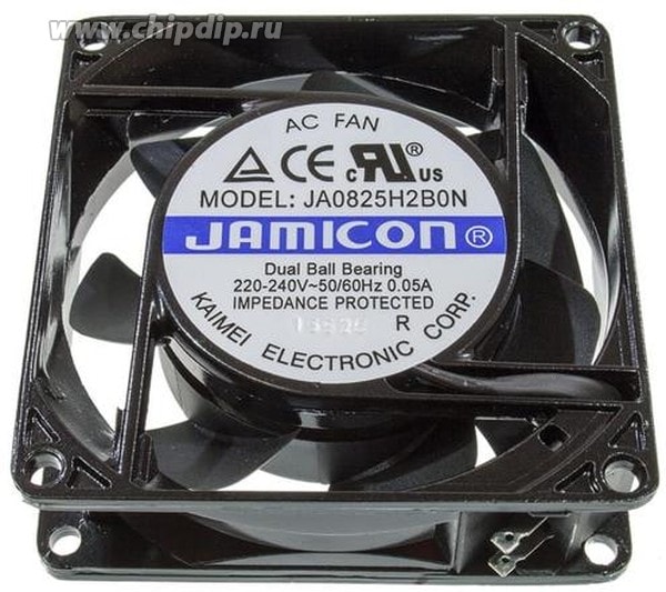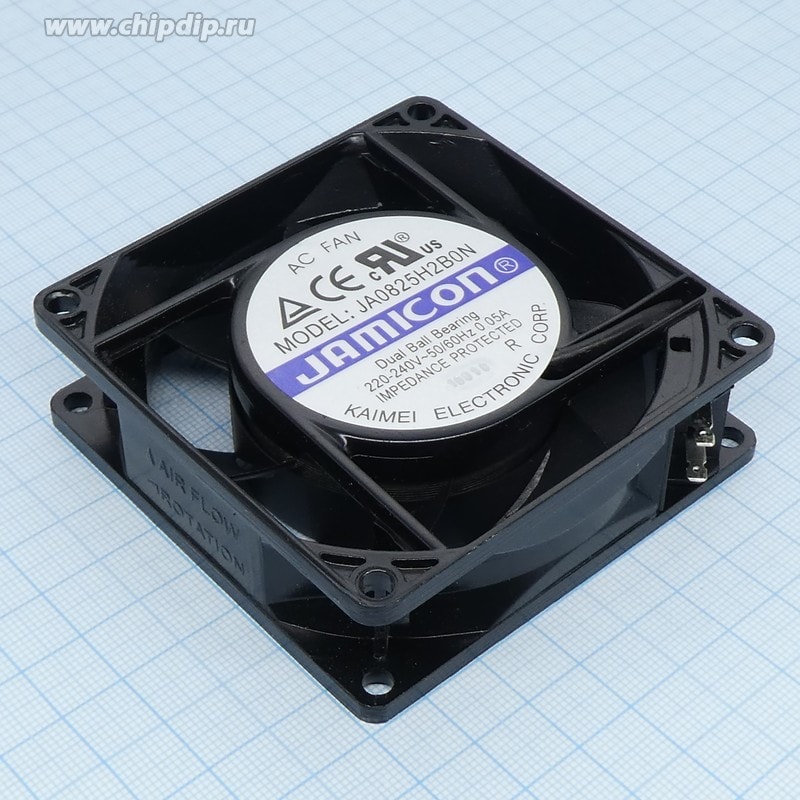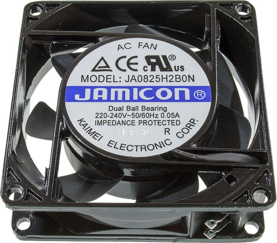 Описание JA0825H2B0N-T — осевой вентилятор переменного тока. В нем расположен подшипник качения, что позволяет использовать вентилятор в условиях повышенных температур. Длина вентилятора составляет 80 мм, ширина 80 мм, а толщина 25 мм. Номинальное напряжение питания 230 В переменного тока при потребляемой мощности 10 Вт. Вентилятор создает максимальный воздушный поток 25. 32 кубических метров в час. При скорости вращения крыльчатки 2000 оборотов в минуту вентилятор вызывает уровень шума 19. 7 дБА. Данная модель эксплуатируется в диапазоне температур от -10 до 70 градусов Цельсия. В качестве материала корпуса вентилятора применяется алюминий, для изготовления крыльчатки используется термопласт. Вентилятор подключается к питанию через разъем. Вентилятор JAMICON JA0825H2B0N-T – осевой тип с воздушным потоком до 25,32 куб.м/ч, размером 80х80х25 мм и уровнем шума 19,7 дБА. Работает от переменного тока AC по напряжению 230 В, с минимальным пусковым напряжением 220 В и максимальным рабочим напряжением 240 В, потребляя 10 Вт с допустимым отклонением мощности и тока до 15%. Вращается со скоростью 2 000 об/мин и имеет разъем для подключения. Корпус и крыльчатка изготовлены из алюминия и термопласта соответственно. Рабочая температура варьируется от -10 до 70 °C, а для защиты от перегрузок предусмотрена резистивная защита. Тип подшипника – качения. Характеристики