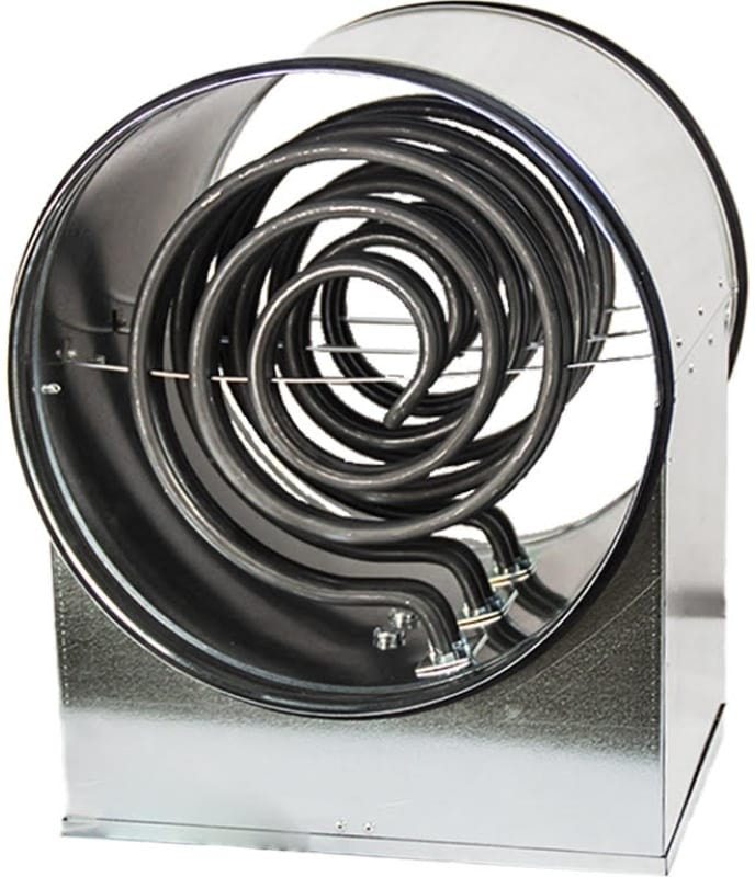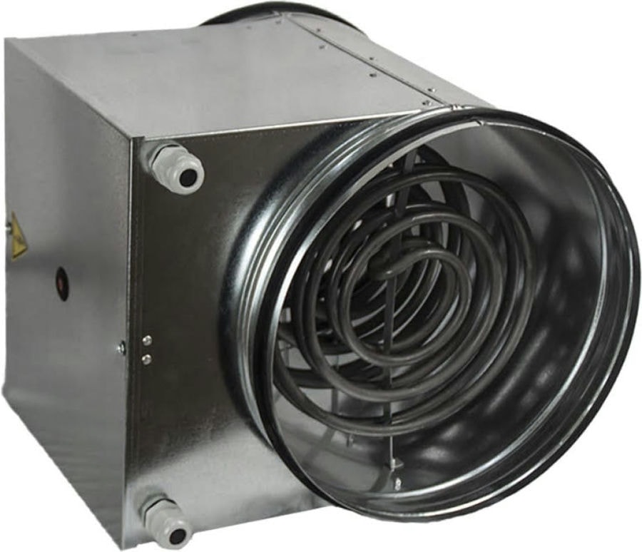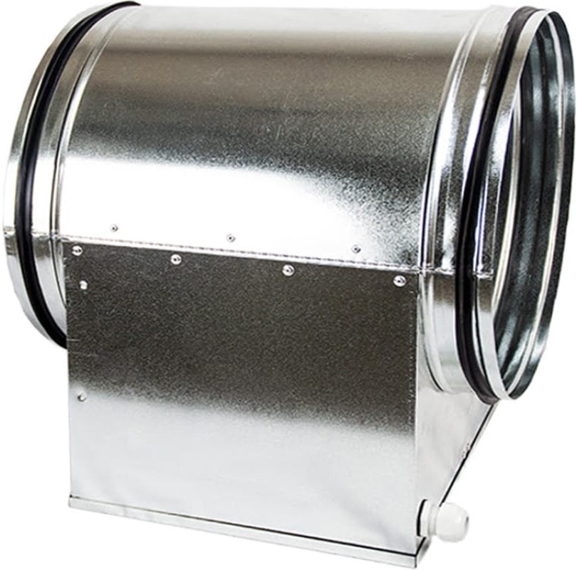 Электрический канальный нагреватель для круглых каналов, корпус и коммутационная коробка изготовлены из оцинкованного стального листа, нагревательные элементы из нержавеющей стали.