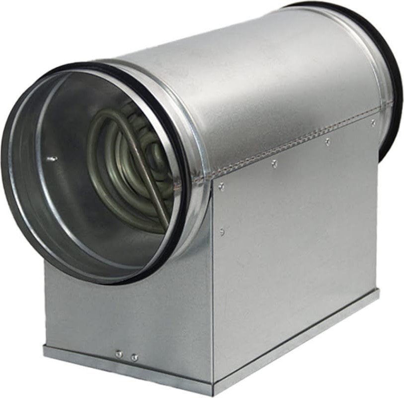 Электрический канальный нагреватель для круглых каналов, корпус и коммутационная коробка изготовлены из оцинкованного стального листа, нагревательные элементы из нержавеющей стали.
