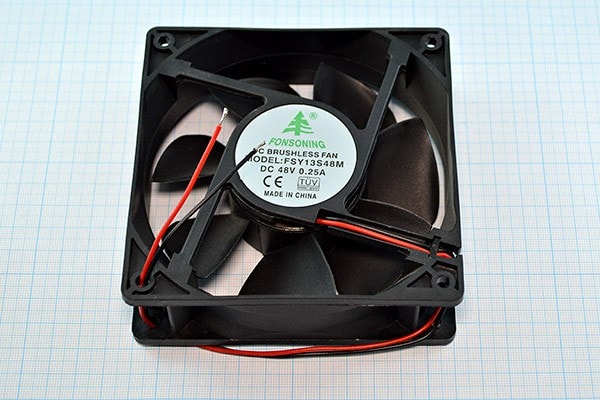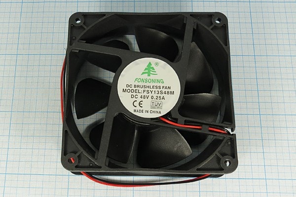 Вентилятор 48 вольт, 120х120х38мм, 3500 об/мин, подшипник скольжения. ВН166M металлическая защитная решётка для вентиляторов размером 120×120мм, ВН432 металлическая защитная решётка с фильтром для вентиляторов размером 120×120мм, ВН235P пластмассовая решетка, ВН239P пластмассовая решётка с воздушным фильтром при необходимости приобретаются отдельно.
