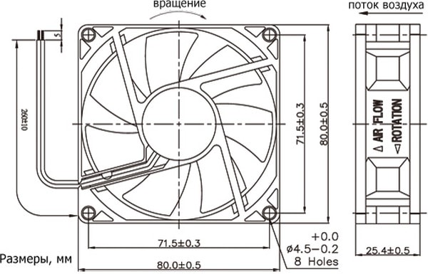 Описание Вентилятор 12В 80х80х25мм подшипник качения 3000об/мин Характеристики